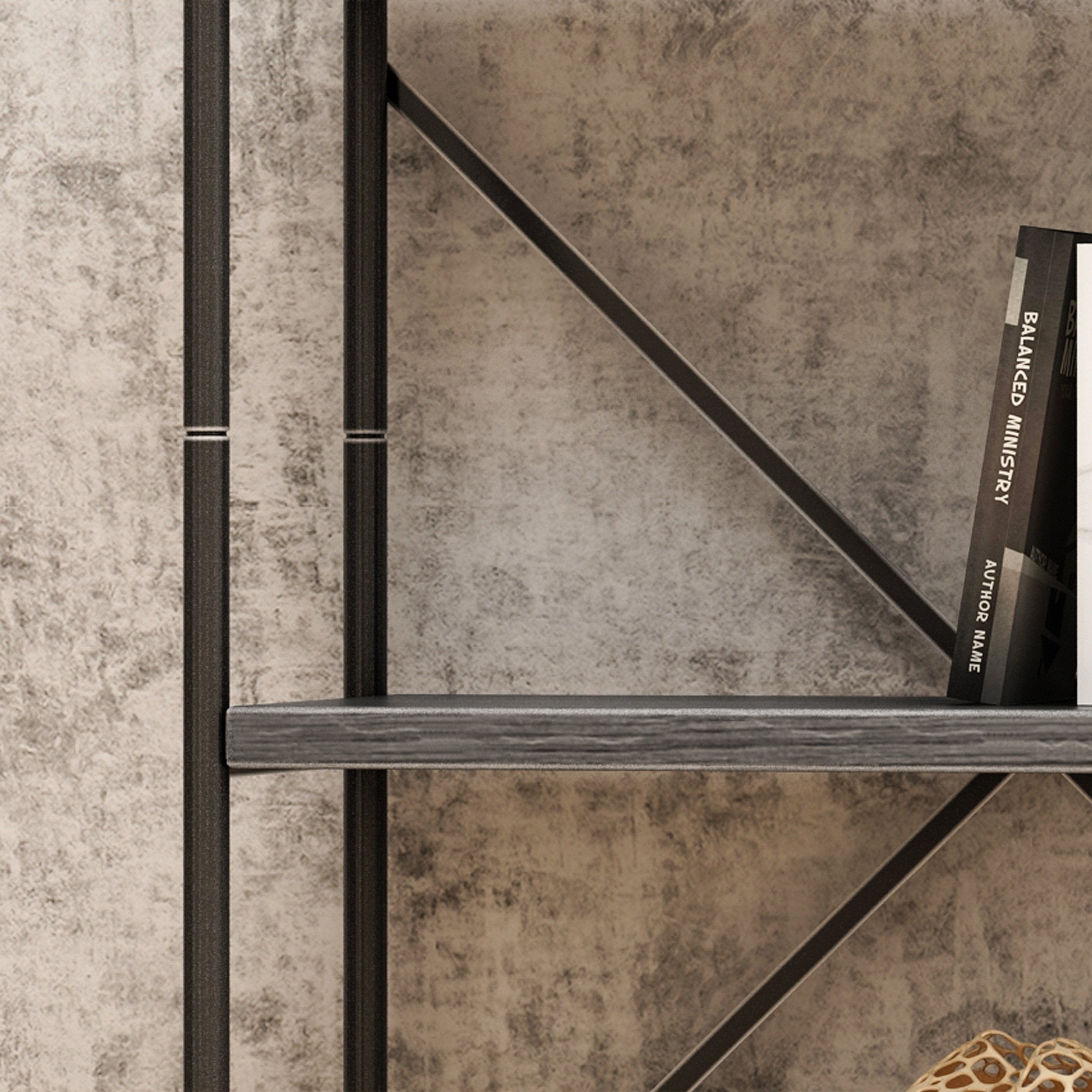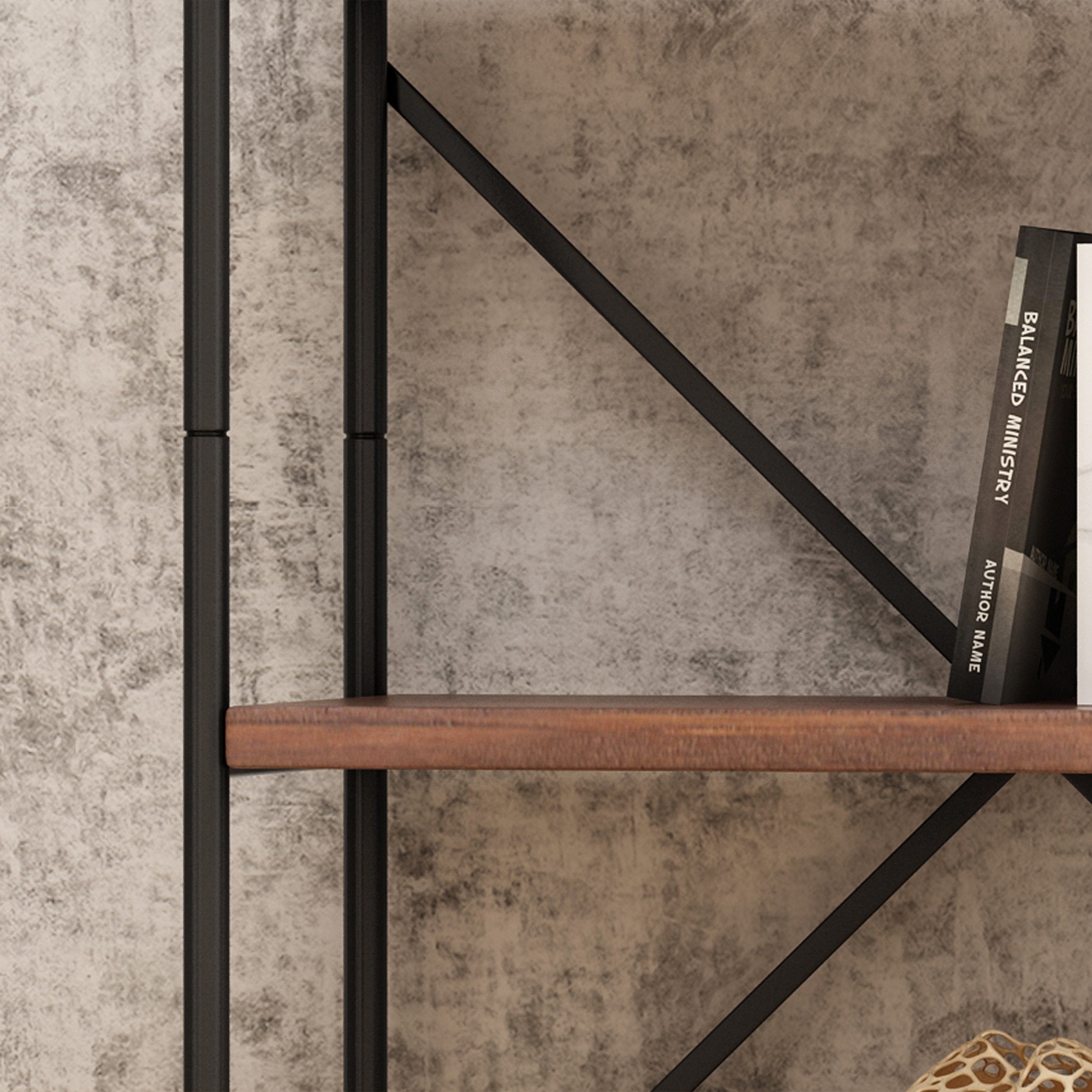 IRON FRAME: The sturdy construction of this iron frame ensures that this bookshelf will hold up under heavy use. This is reinforced with an X-frame iron stretcher on the back of the bookshelf.