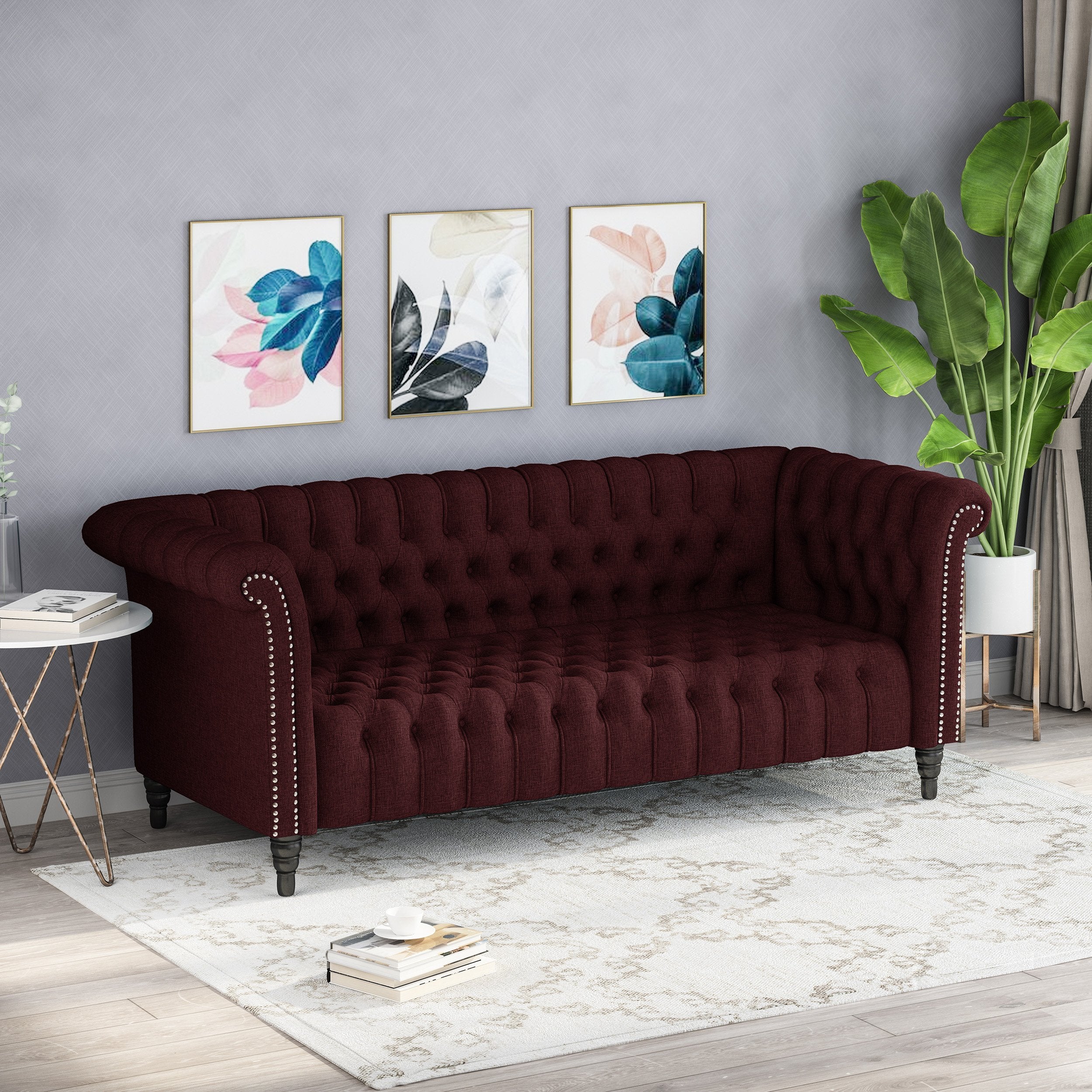 CHESTERFIELD STYLE: Designed with the traditional Chesterfield sofa in mind, this piece hits all the key elements, with deep button tufting, nailhead accents, scrolled arms, and turned legs.