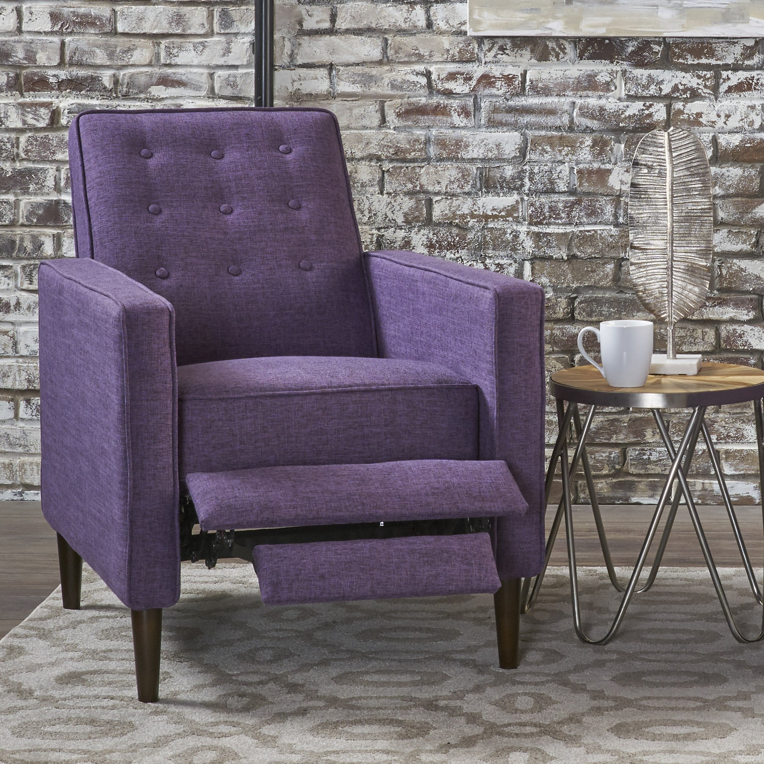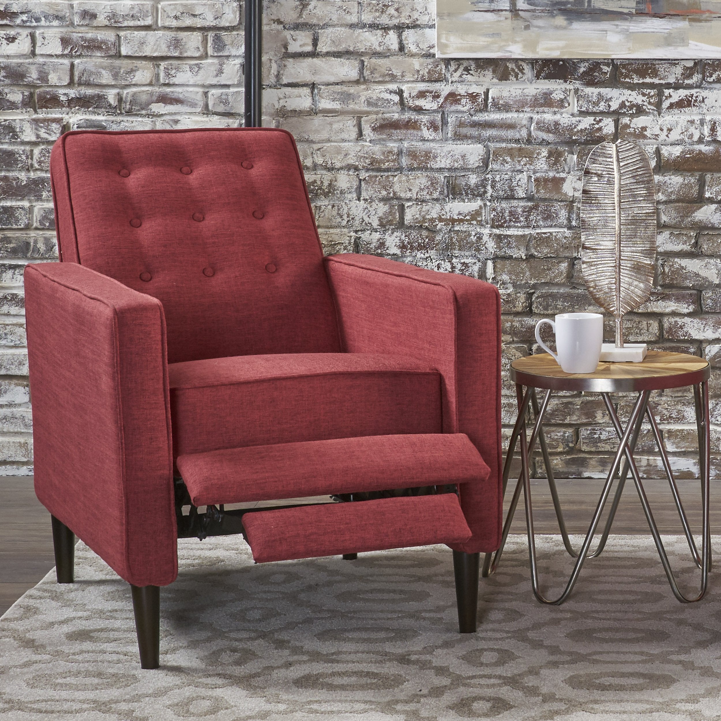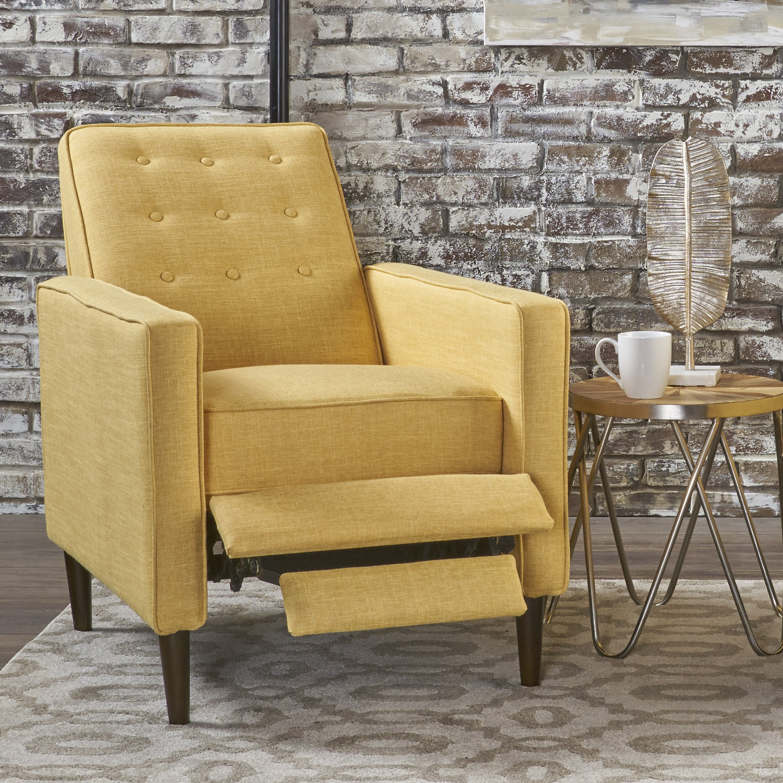 This mid-century, modern recliner is a wonderful addition to any room in your home. Featuring clean lines and a smooth finish, no one will even know that this chair is a recliner until you are putting your feet up after a long day. Complete with a slightly tufted back and an extra padded cushion for maximum comfort, this recliner does it all. Everyone will be asking for a turn to relax in this recliner chair of yours.