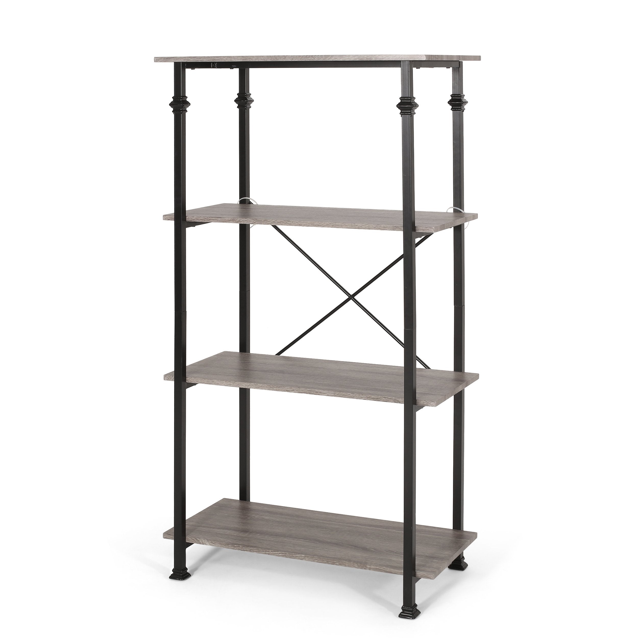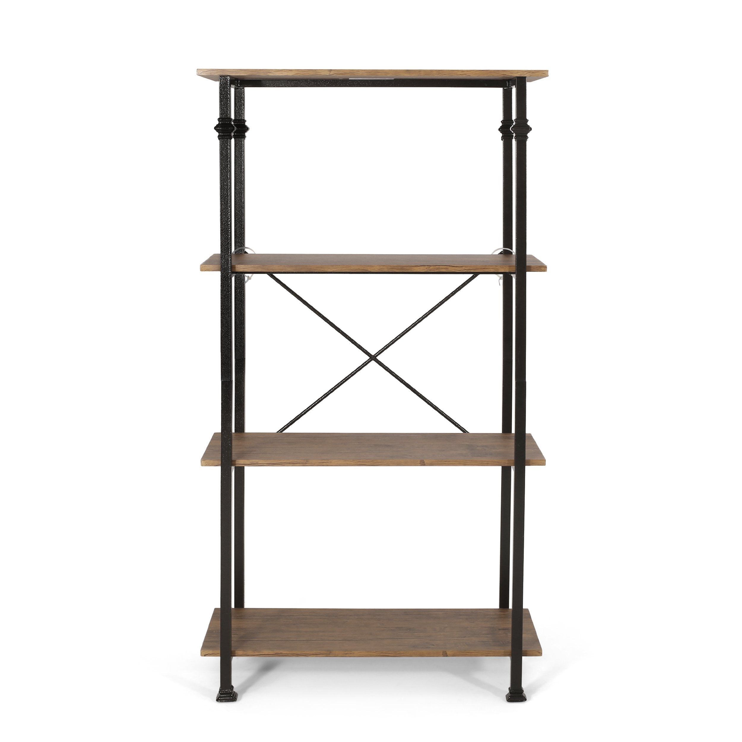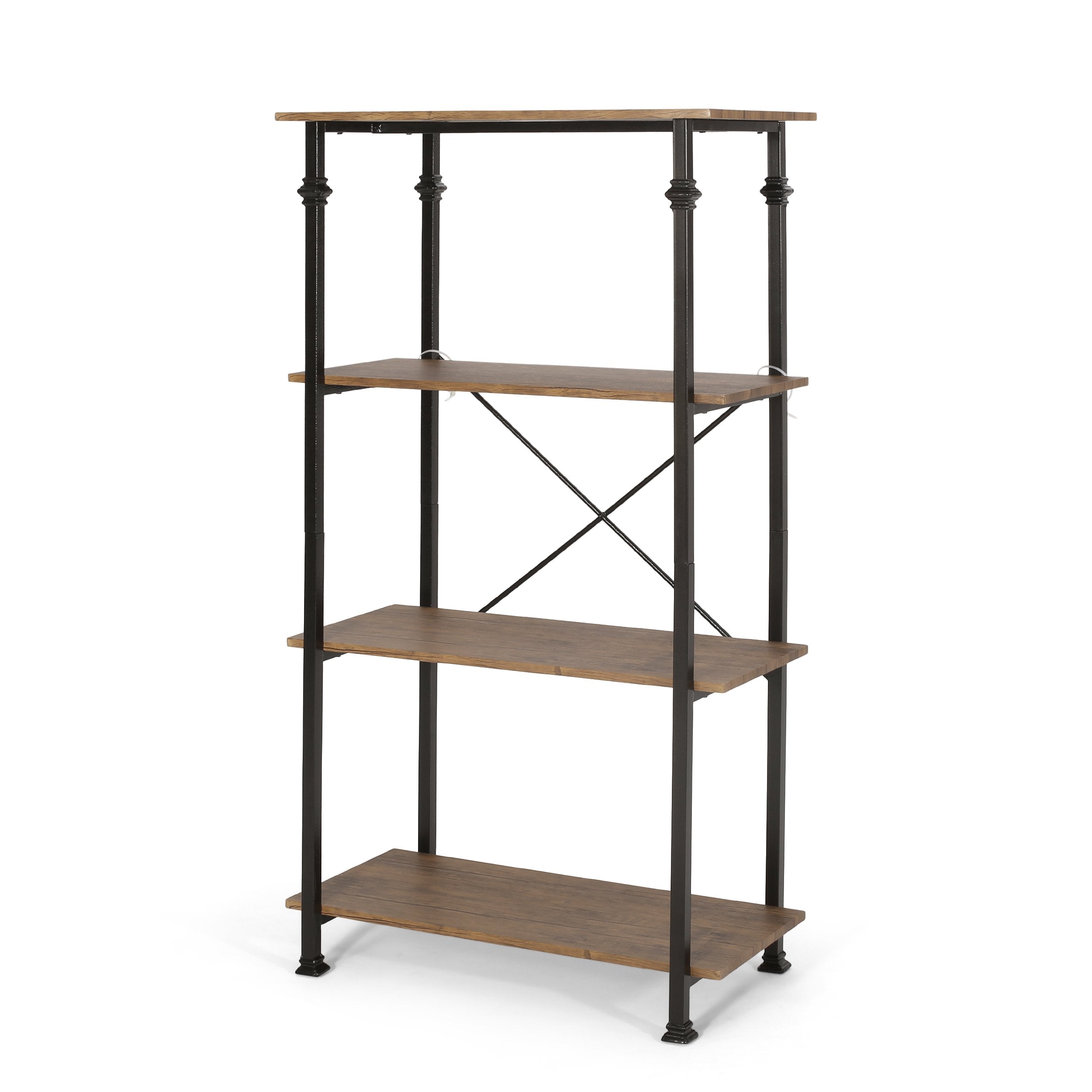 Fit our stunning bookcase into any space of your home for an excellent upgrade. Featuring a modern industrial design, this bookcase uses a metal frame for an exposed yet stylish look. This is finished with beautifully turned accents to create a highly durable structure that is fortified with an X-frame stretcher to ensure the best stability for your home. Finished with a beautiful wood look, this piece offers four sturdy shelves that provide ample space for display and organization, allowing you to easily personalize your home.